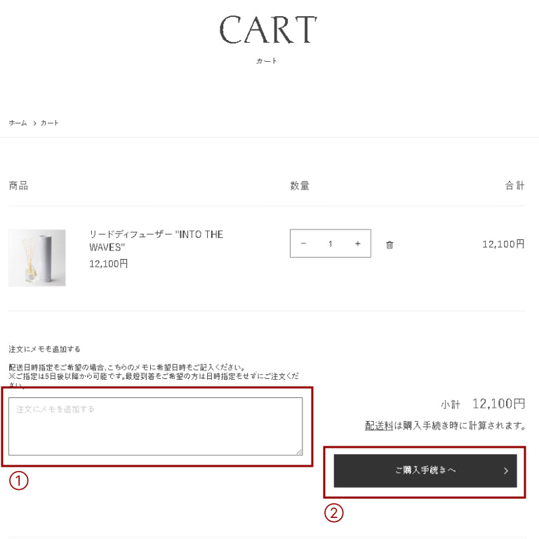 (3)カート内商品に間違いがなければ②「ご購入手続きへ」を押してください。 -